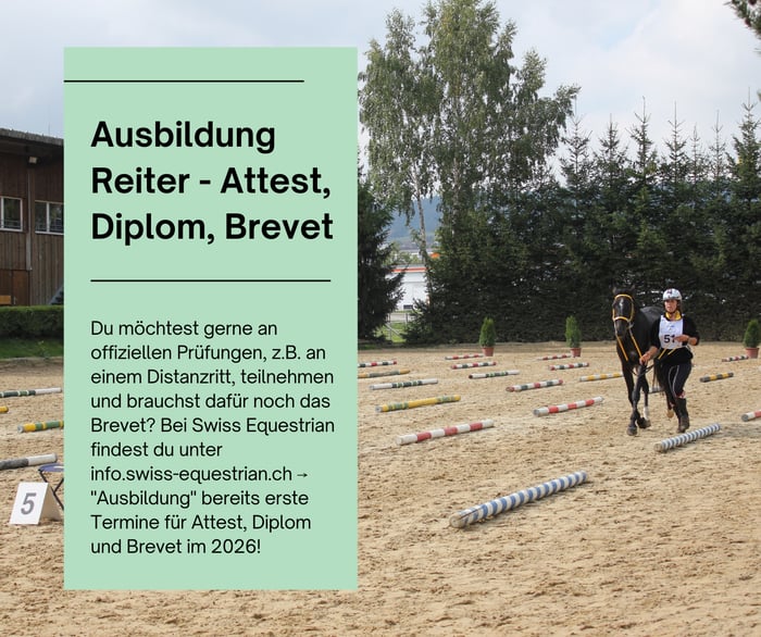 Du möchtest gerne an offiziellen Prüfungen, z.B. an einem Distanzritt, teilnehmen und brauchst dafür noch das Brevet? Bei Swiss Equestrian findest du unter info.swiss-equestrian.ch unter "Ausbildung" bereits erste Termine für Attest, Diplom und Brevet im 2026!
